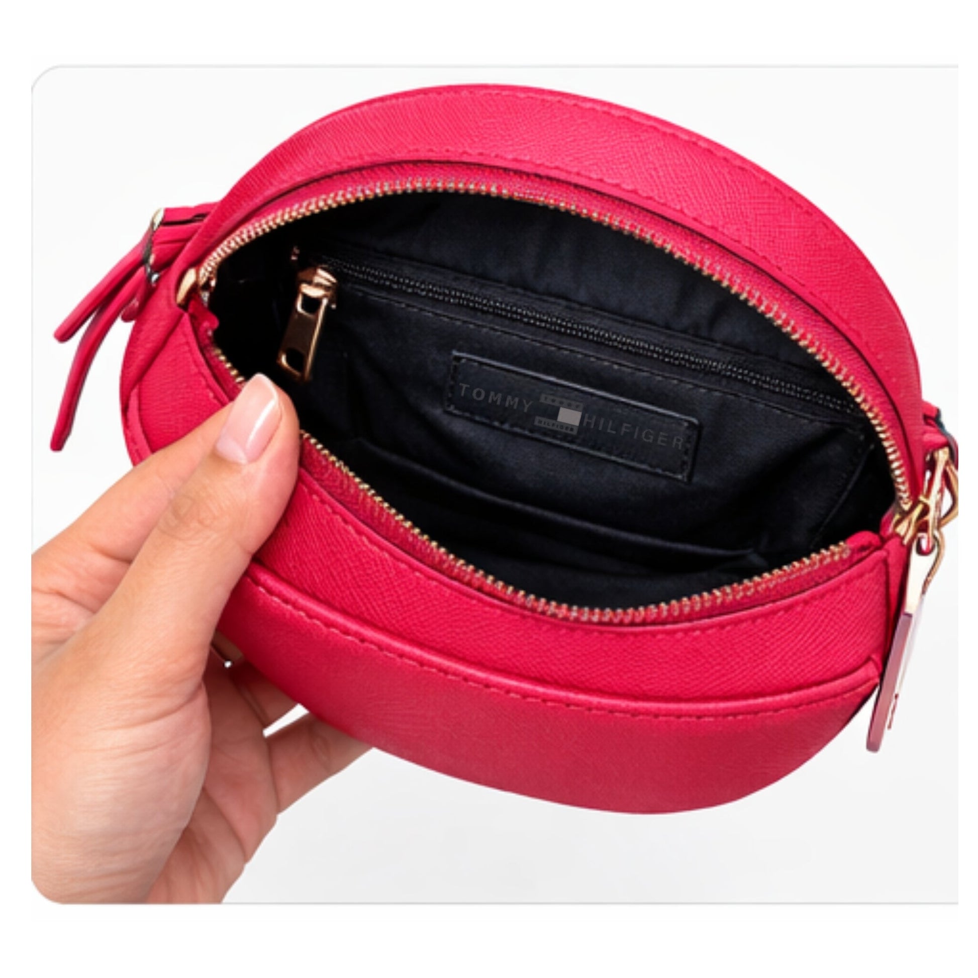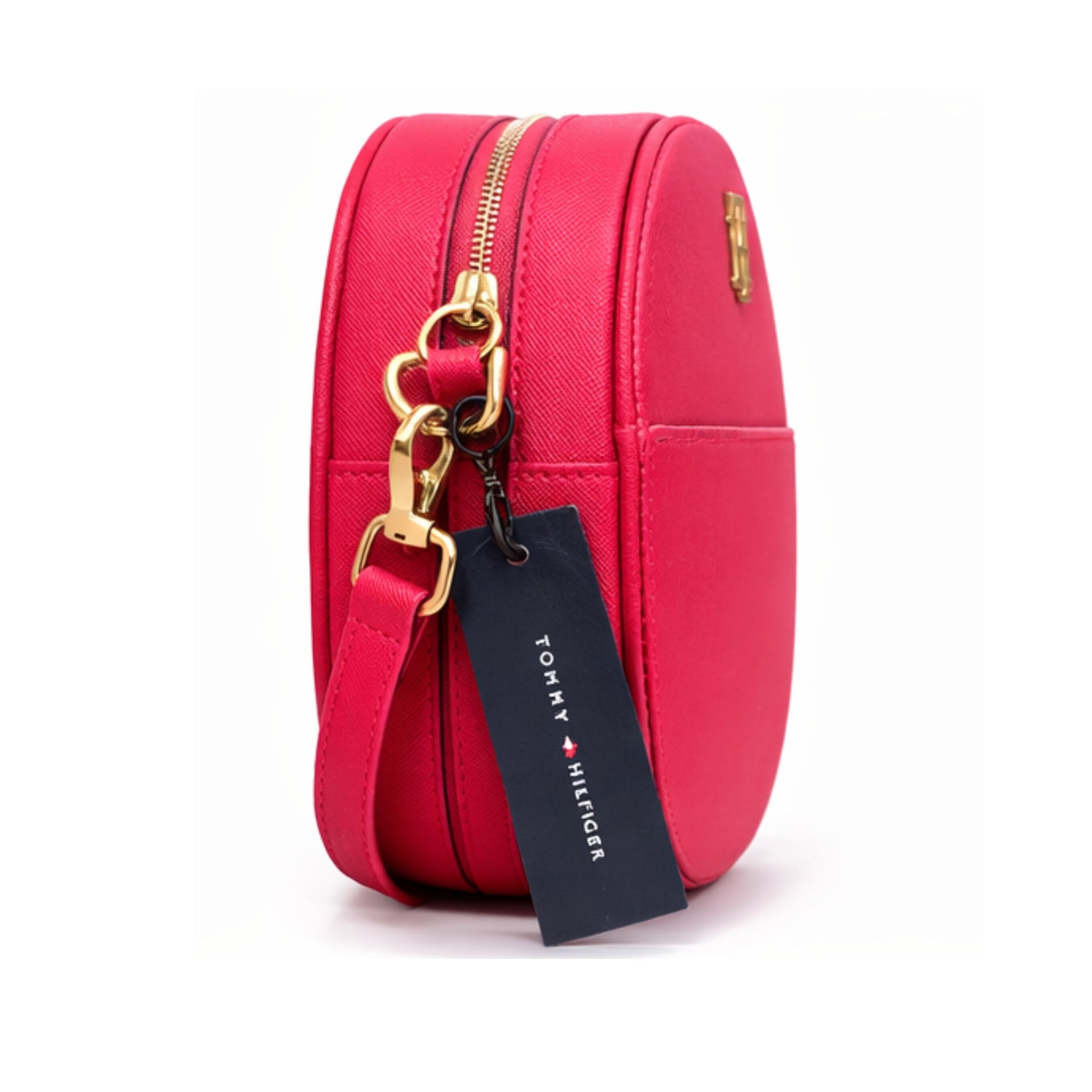 La cartera Tommy Hilfiger Joy LI Canteen Crossbody en color rojo destaca por su diseño moderno y elegante de forma circular, ideal para mujeres que buscan un accesorio práctico con estilo.